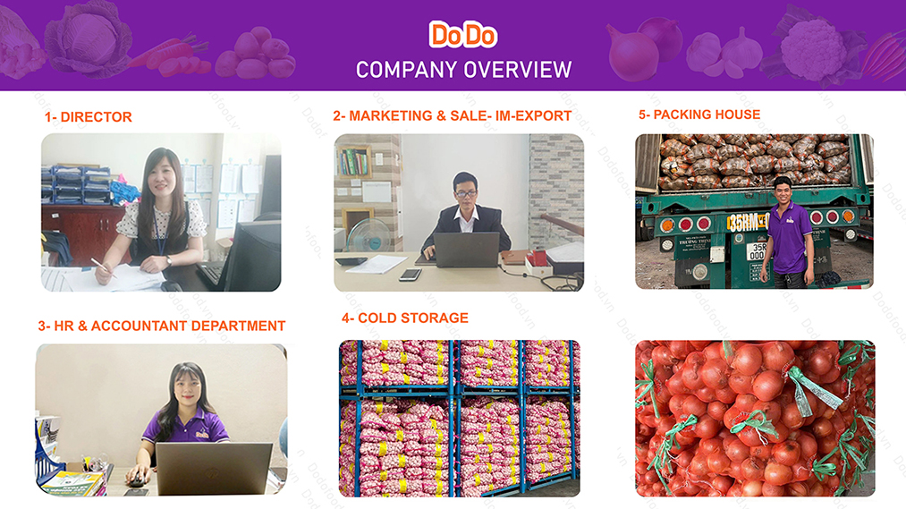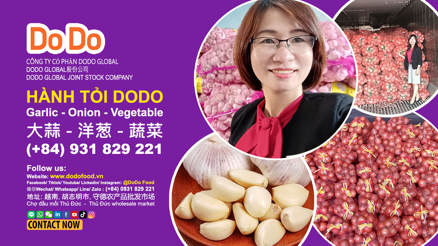 Công ty cổ phần DoDo Global một trong những đơn vị chuyên về xuất nhập khẩu, phân phối và mua bán hành tây, tỏi , rau củ quả tại Việt Nam. Với nhiều năm kinh nghiệm trong lĩnh vực nông sản, đặc biệt là (tỏi và hành tây, gừng, ớt, khoai tây, cà rốt...) DODO đã khẳng định vị thế của mình trên thị trường trong nước và quốc tế.