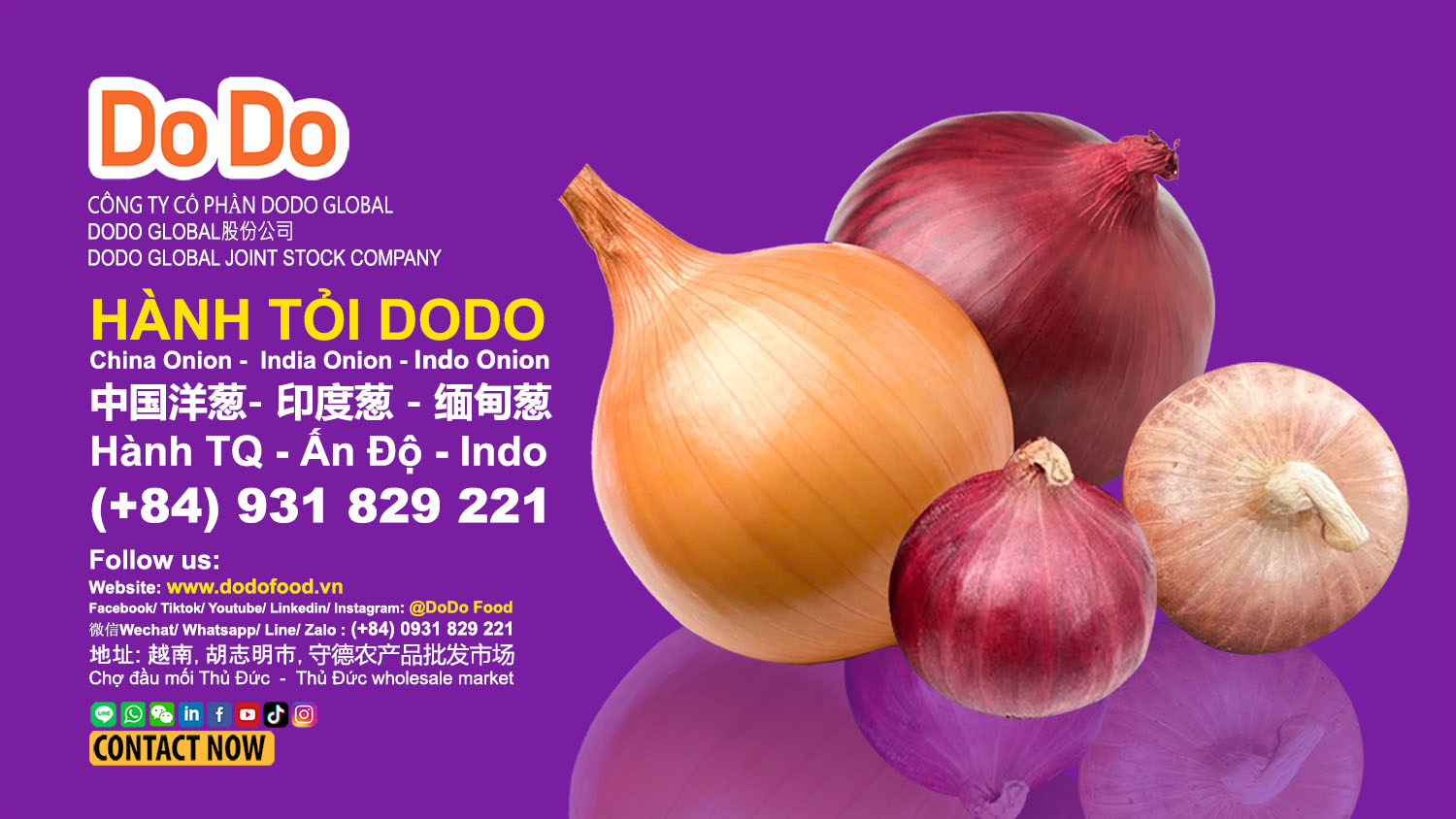 Công ty cổ phần DoDo Global một trong những đơn vị chuyên về xuất nhập khẩu, phân phối và mua bán hành tây, tỏi , rau củ quả tại Việt Nam. Với nhiều năm kinh nghiệm trong lĩnh vực nông sản, đặc biệt là (tỏi và hành tây, gừng, ớt, khoai tây, cà rốt...) DODO đã khẳng định vị thế của mình trên thị trường trong nước và quốc tế.