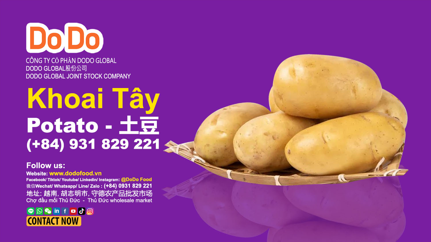 DODO在农业市场上拥有强大的影响力,为国内外买家提供高质量的大蒜、洋葱、土豆、生姜、辣椒、胡萝卜、蔬菜和水果,确保价格竞争力强且来源可靠,并出口越南农产品。