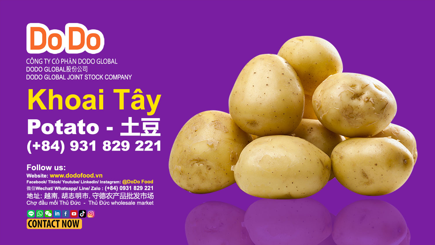 DODO在农业市场上拥有强大的影响力,为国内外买家提供高质量的大蒜、洋葱、土豆、生姜、辣椒、胡萝卜、蔬菜和水果,确保价格竞争力强且来源可靠,并出口越南农产品。